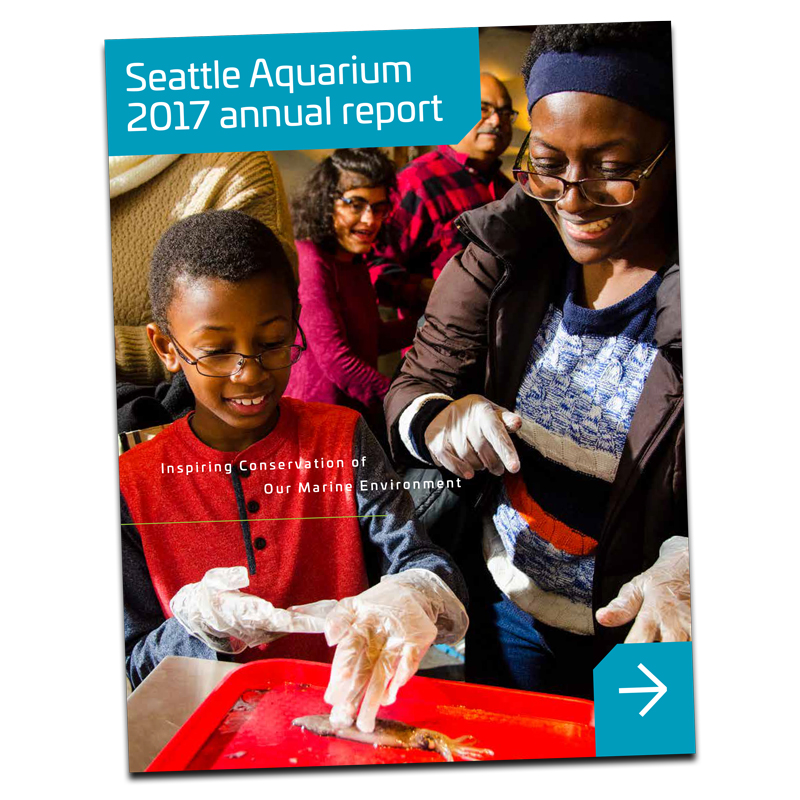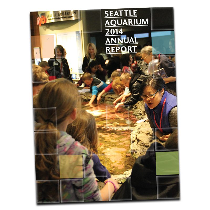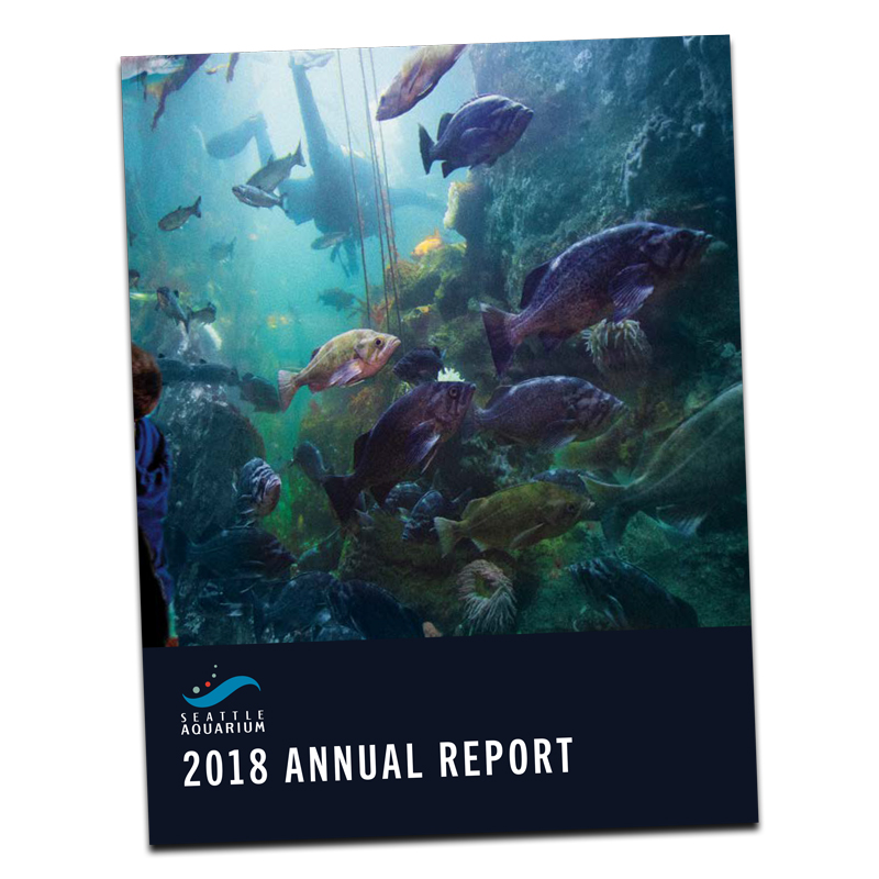 Phil Levin, a researcher at NOAA, provided close to 100 pages of research related to the inherent trade-offs associated with conservation actions in Puget Sound. It was our job to translate that into informational signage that worked to inform and educate Seattle Aquarium guests while bringing color and life to an otherwise dull hallway. The result is a graphic panel that is 6′ tall and 80′ long—and it’s gratifying to see people stop to read it as they move from one habitat to another. I was able to use a few personal pictures in the photo collage—my mom, one of my kids, the child of a friend and a favorite coworker (shoutout to Amy Z.!).
